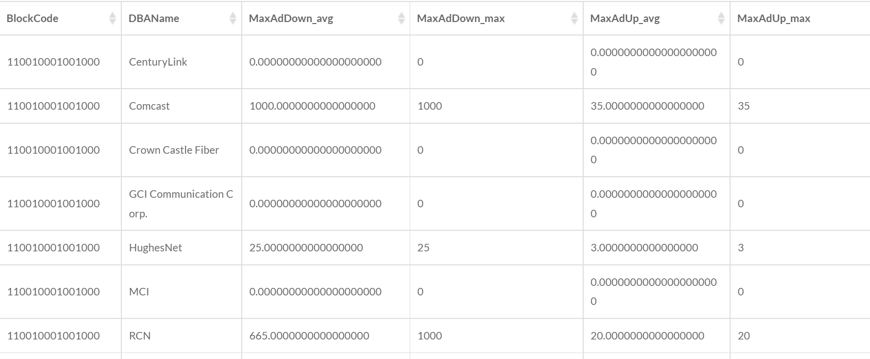 For example, the input data above are the broadband deployment data for blocks in an area. The block FIPS code BlockCode and the provider DBAName can be the Group Fields, and the values in the same group will be aggregated. The max advertised downstream speed MaxAdDown and the max advertised upstream speed MaxAdUp can be selected to be added to the new output data. Merge rules (e.g. Average, Max) should be set for each output field. And the output data could be as follows: