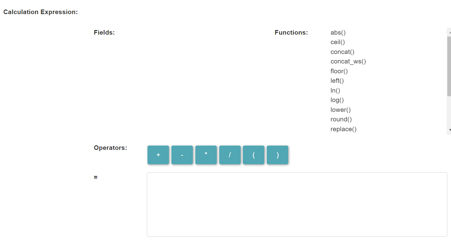 - Function List: It lists the functions that can be used. You can click on a function to add it to the expression input area. You can also manually enter the function name directly in the input area.