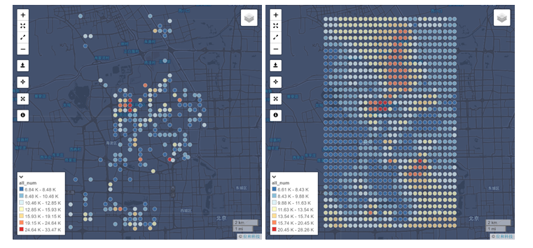 The figures below shows the difference between the original population distribution map and the population distribution map processed by Interpolate function. The second map can clearly demonstrate the continuous population distribution over an entire area.