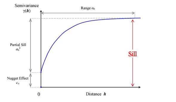 Nugget: the difference between the spatial points in the initial stage of the semi-variance function. Conceptually, the semi-variance should be zero when the distance is also zero; however, the spatial variance caused Nugget effect to have an initial difference