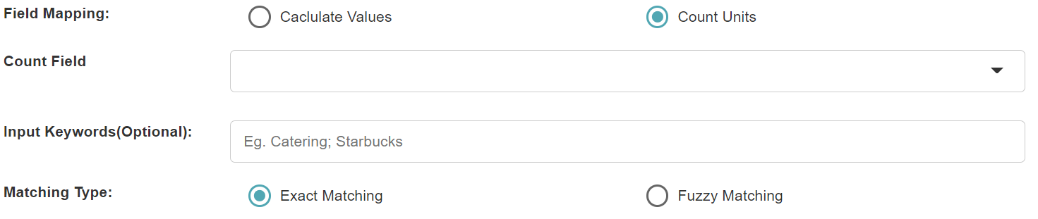 - Input Keywords (optional): If no keywords are entered, all different values in the count field are counted. When keywords are entered, only the values of the count fields that match the keywords are counted. Multiple keywords should be separated by ";" (e.g. "Restaurant;Starbucks").